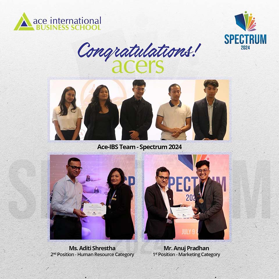 Students from the BBA program participated in Ace-Spectrum 2024. The team included Ms. Aditi Shrestha (VIII Sem, Fall 2020), Mr. Anuj Kharge (Year 2 Trim B, Fall 2022), Mr. Anuj Pradhan (VIII Sem, Fall 2020), Ms. Bibisha Kharel (Year 3 Trim B, Fall 2021), and Mr. Prayush Shrestha (Year 3 Trim B, Fall 2021).